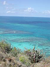 Rick kept jumping from one rock to another, hoping for a glimpse of a shark, but they seemed to be hiding. We decided that the view was well worth the trip, even without any sharks. It was great to be up so high, all by ourselves. There were a huge number of cacti up on top of the island. Click here to view even more. Afterwards we went around the island in the boat, looking at the reefs up close. Then back to the resort for lunch. We both decided that we're not going to eat for two weeks after we get home!